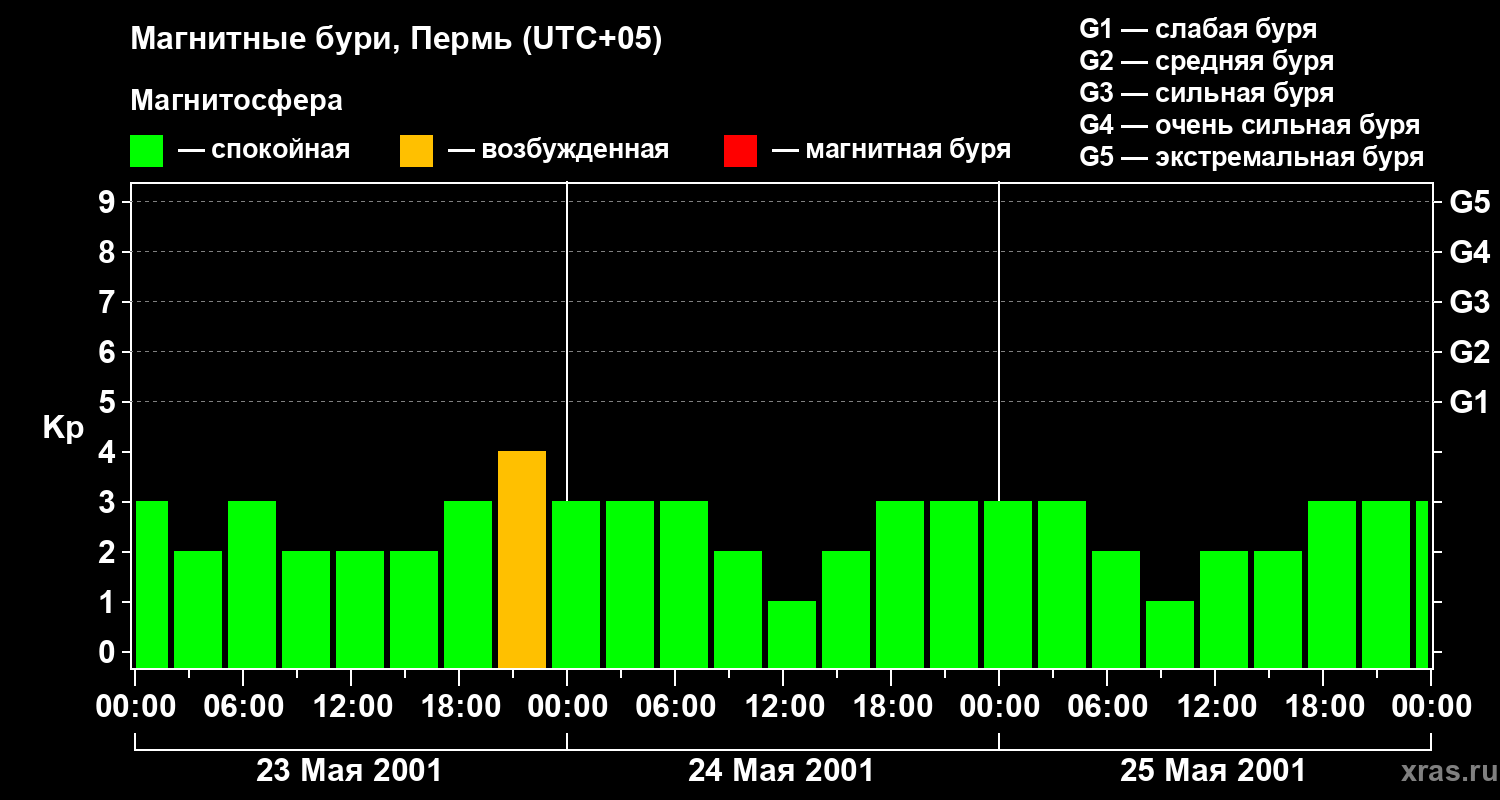 Изменения геомагнитного индекса Kp с 23 по 25 мая 2001 года для средних широт