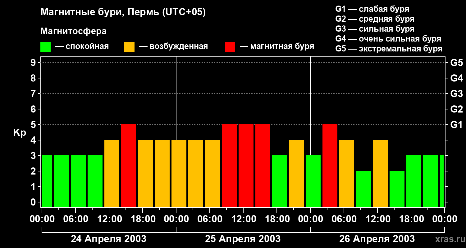 Изменения геомагнитного индекса Kp с 24 по 26 апреля 2003 года для средних широт