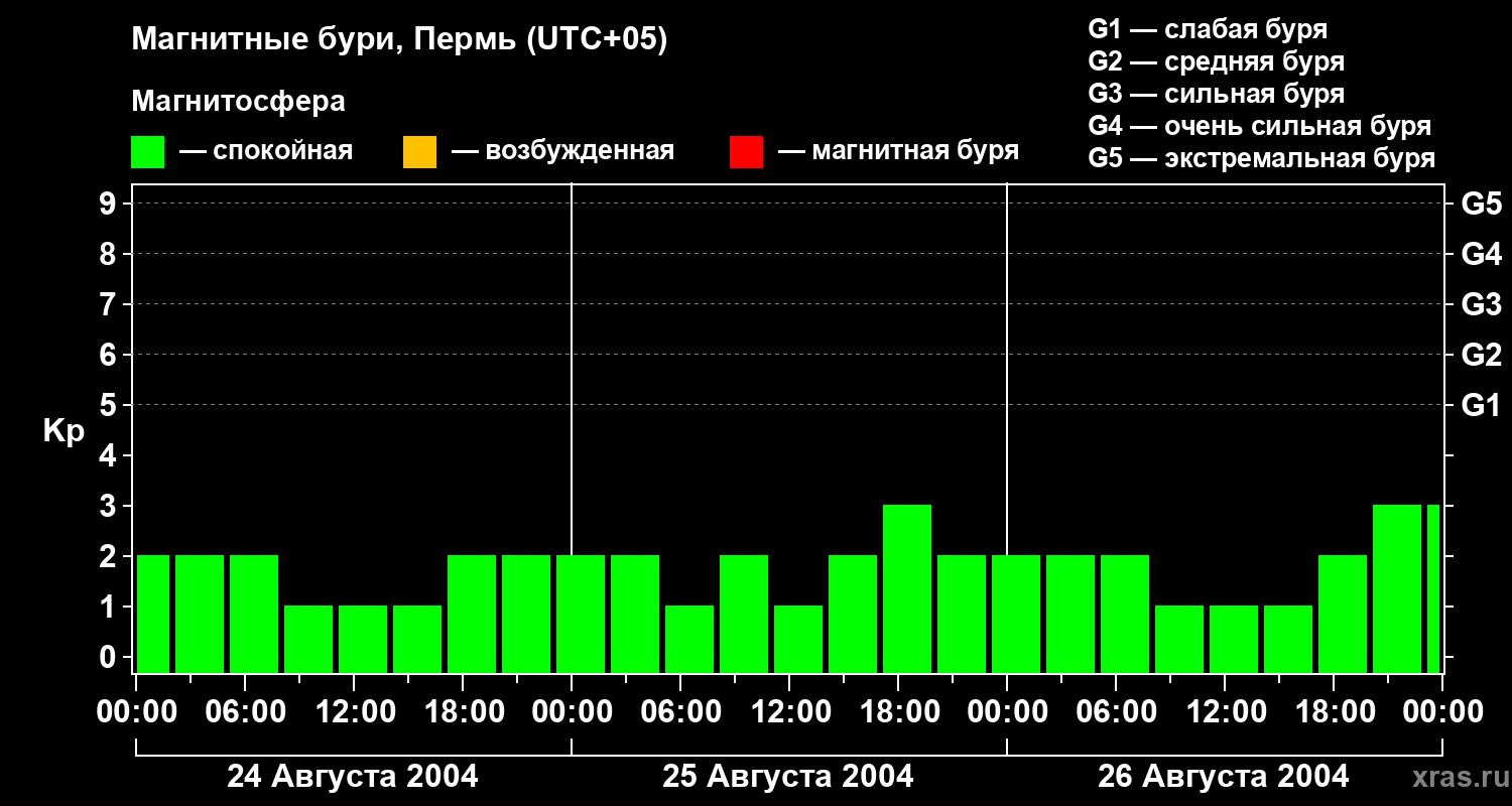 Изменения геомагнитного индекса Kp с 24 по 26 августа 2004 года для средних широт