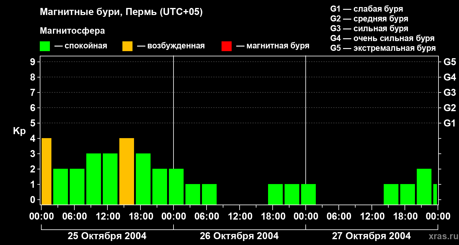 Изменения геомагнитного индекса Kp с 25 по 27 октября 2004 года для средних широт