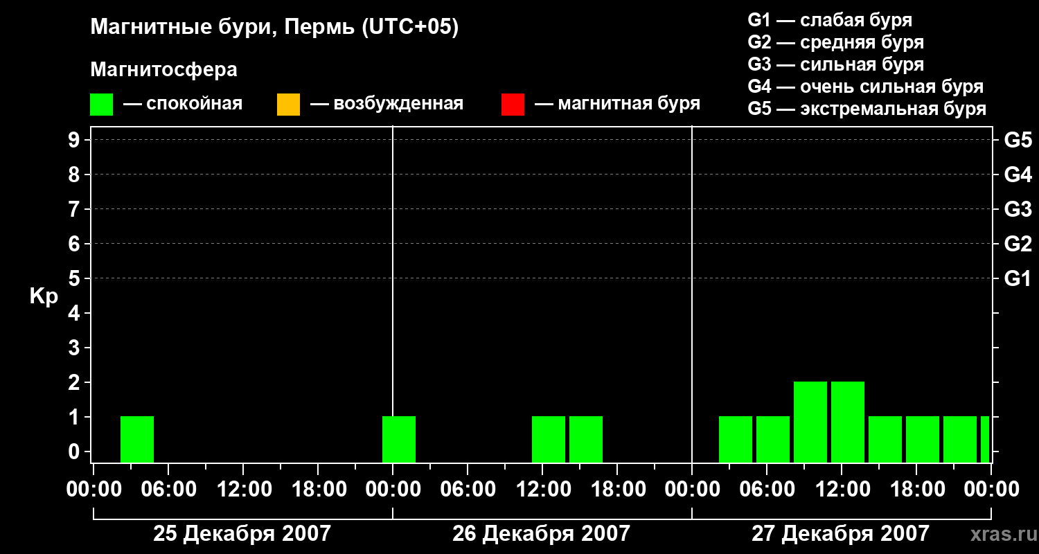 Изменения геомагнитного индекса Kp с 25 по 27 декабря 2007 года для средних широт