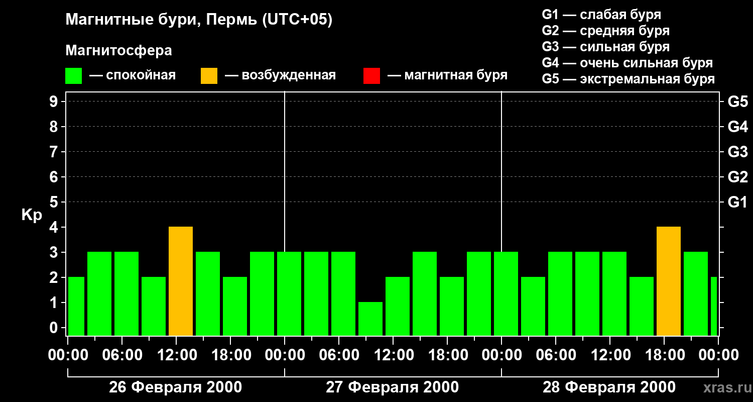 Изменения геомагнитного индекса Kp с 26 по 28 февраля 2000 года для средних широт