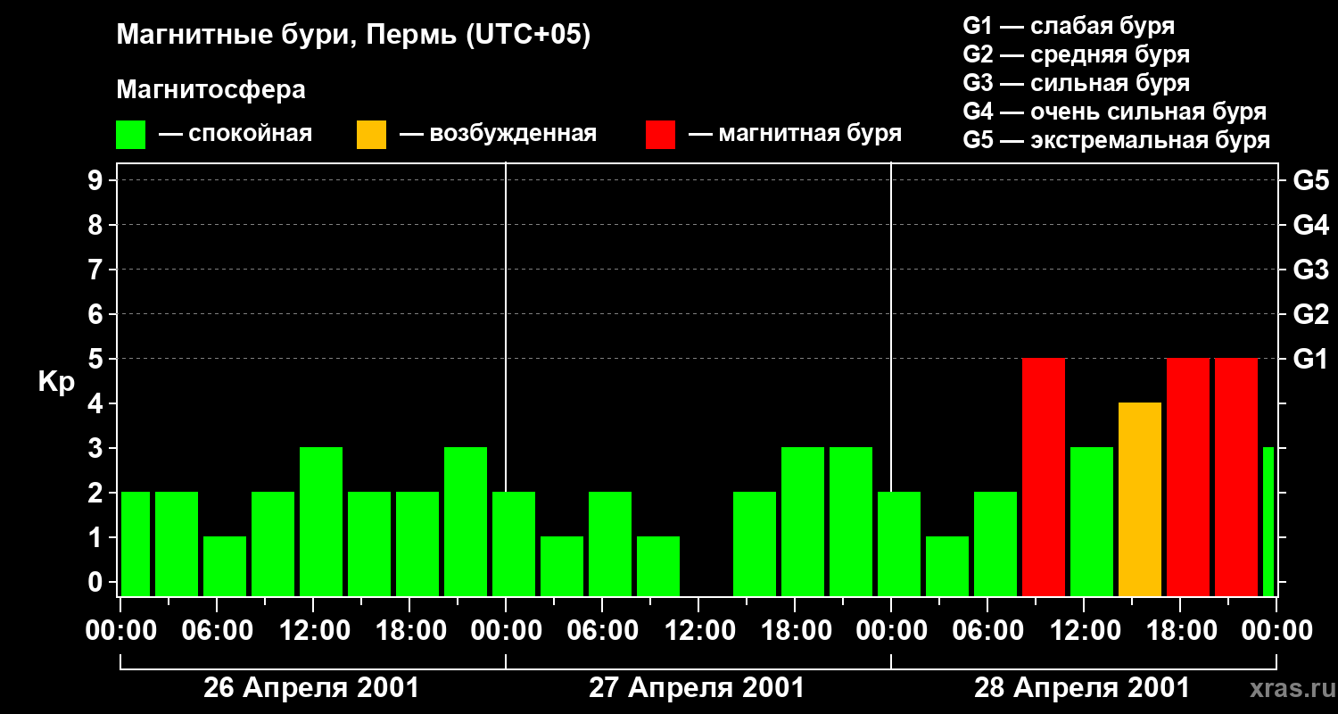 Изменения геомагнитного индекса Kp с 26 по 28 апреля 2001 года для средних широт