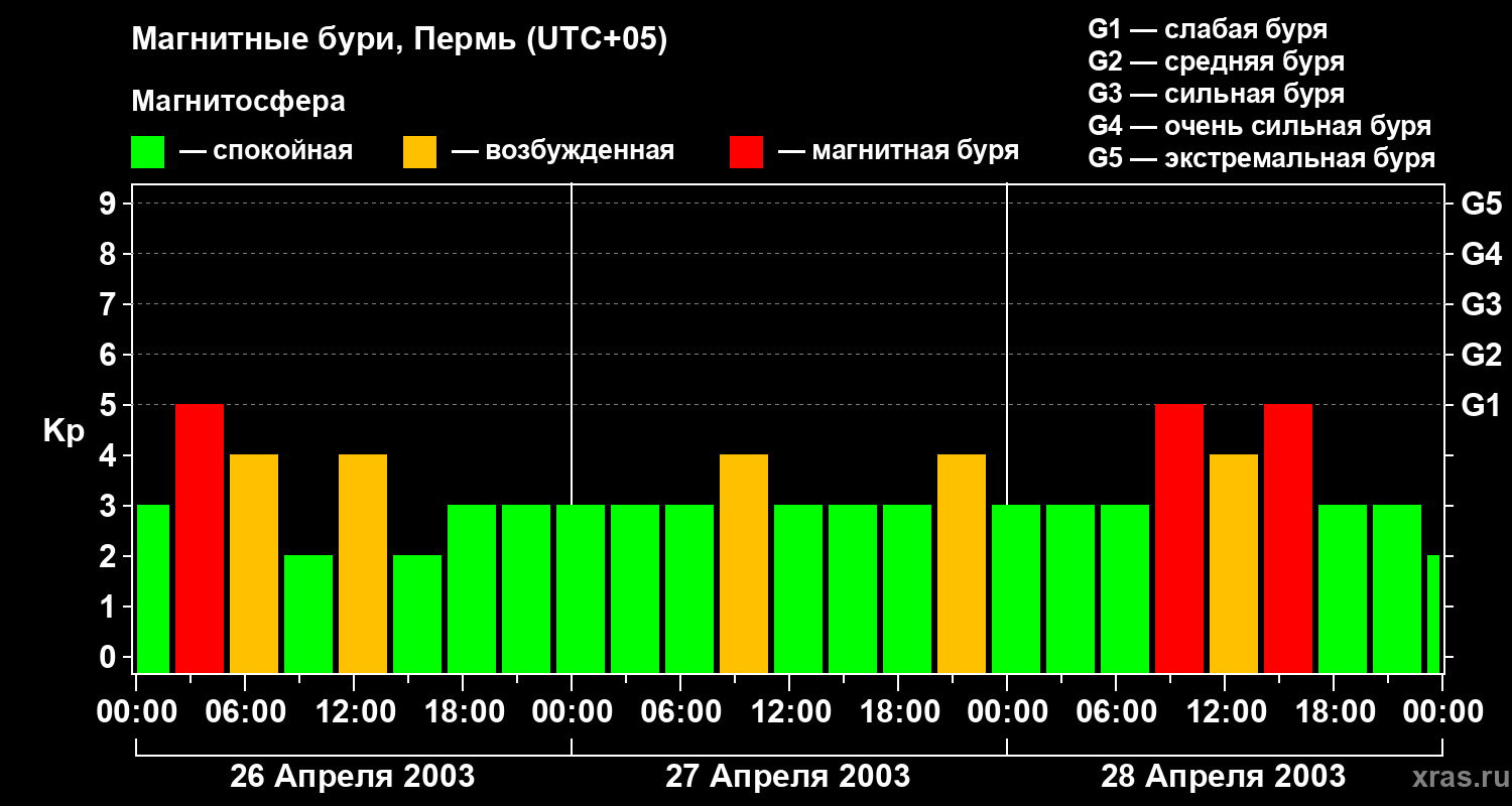 Изменения геомагнитного индекса Kp с 26 по 28 апреля 2003 года для средних широт