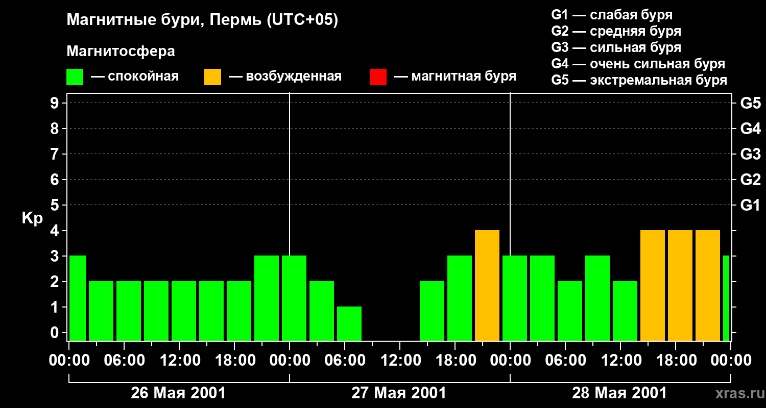Изменения геомагнитного индекса Kp с 26 по 28 мая 2001 года для средних широт