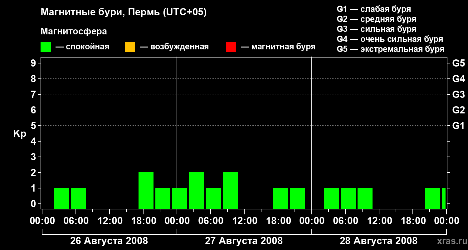 Изменения геомагнитного индекса Kp с 26 по 28 августа 2008 года для средних широт