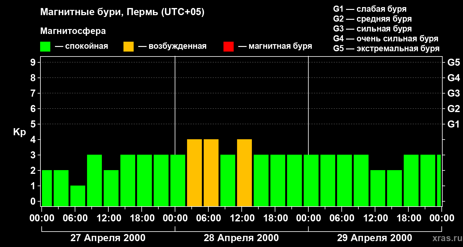 Изменения геомагнитного индекса Kp с 27 по 29 апреля 2000 года для средних широт