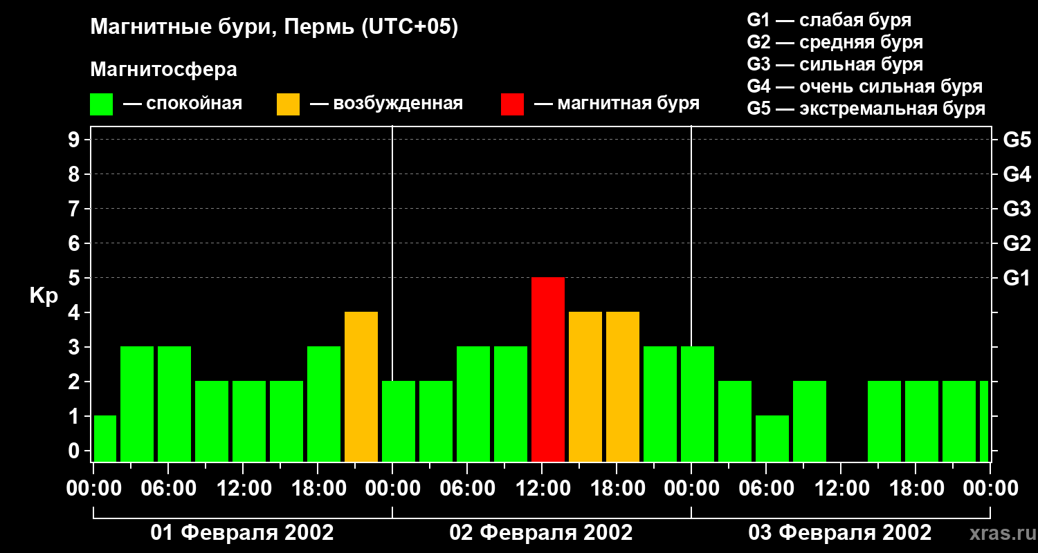 Изменения геомагнитного индекса Kp с 1 по 3 февраля 2002 года для средних широт
