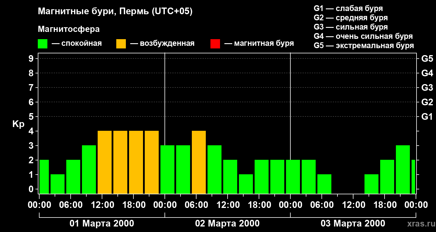 Изменения геомагнитного индекса Kp с 1 по 3 марта 2000 года для средних широт