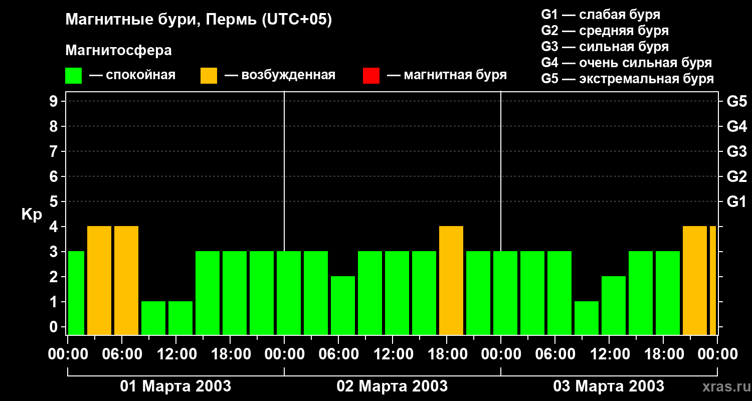 Изменения геомагнитного индекса Kp с 1 по 3 марта 2003 года для средних широт