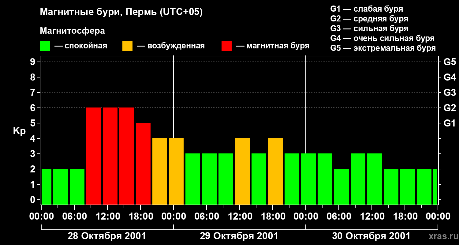 Изменения геомагнитного индекса Kp с 28 по 30 октября 2001 года для средних широт