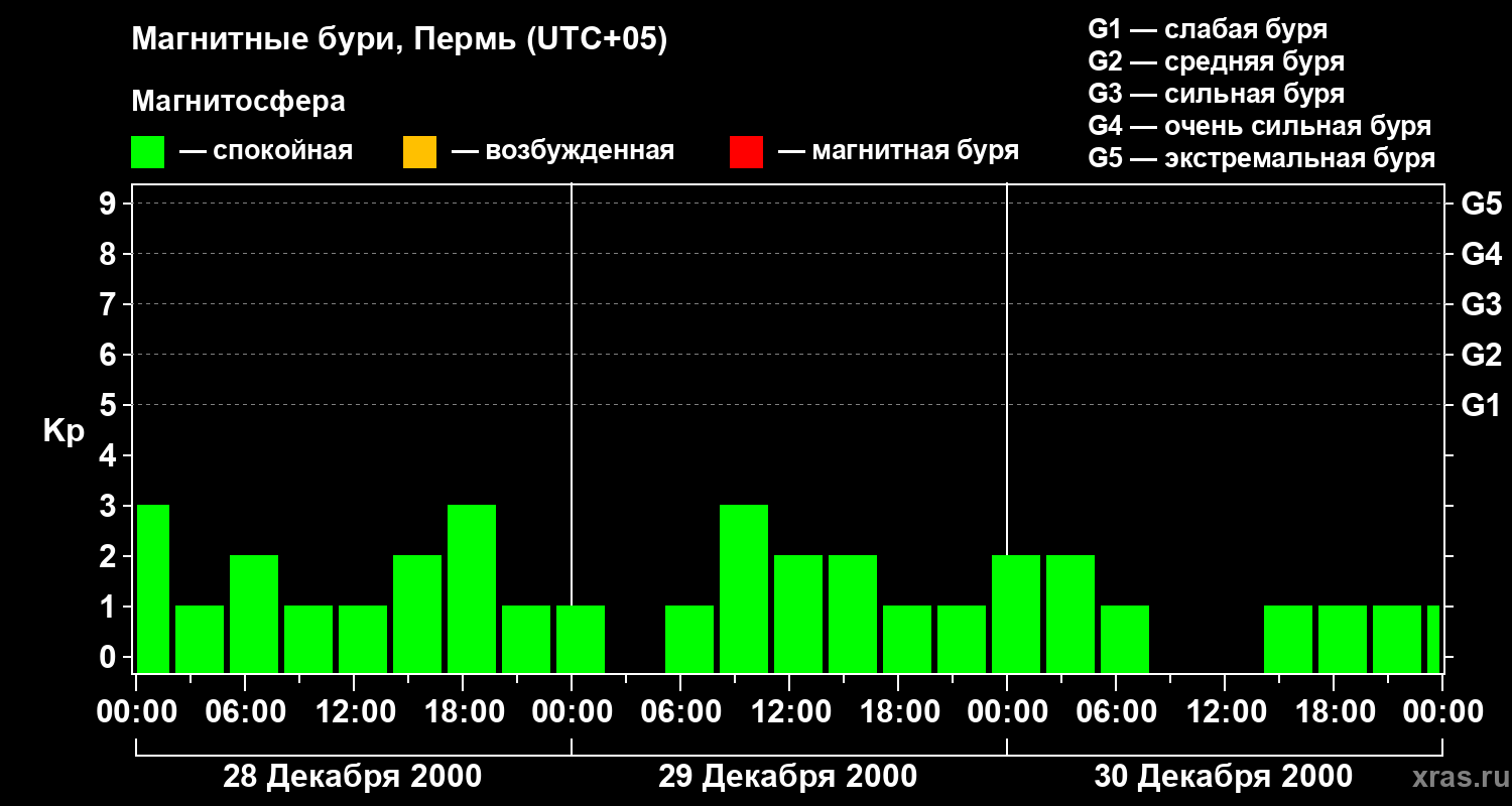 Изменения геомагнитного индекса Kp с 28 по 30 декабря 2000 года для средних широт