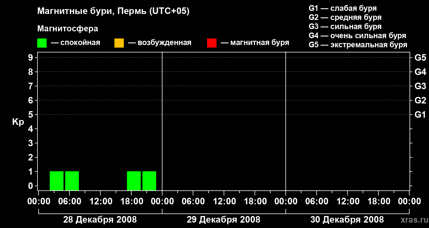 Изменения геомагнитного индекса Kp с 28 по 30 декабря 2008 года для средних широт