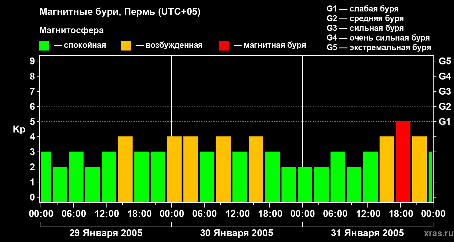Изменения геомагнитного индекса Kp с 29 по 31 января 2005 года для средних широт