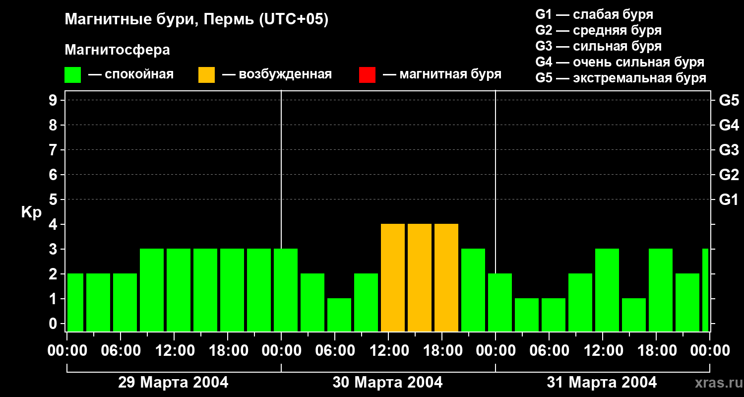 Изменения геомагнитного индекса Kp с 29 по 31 марта 2004 года для средних широт