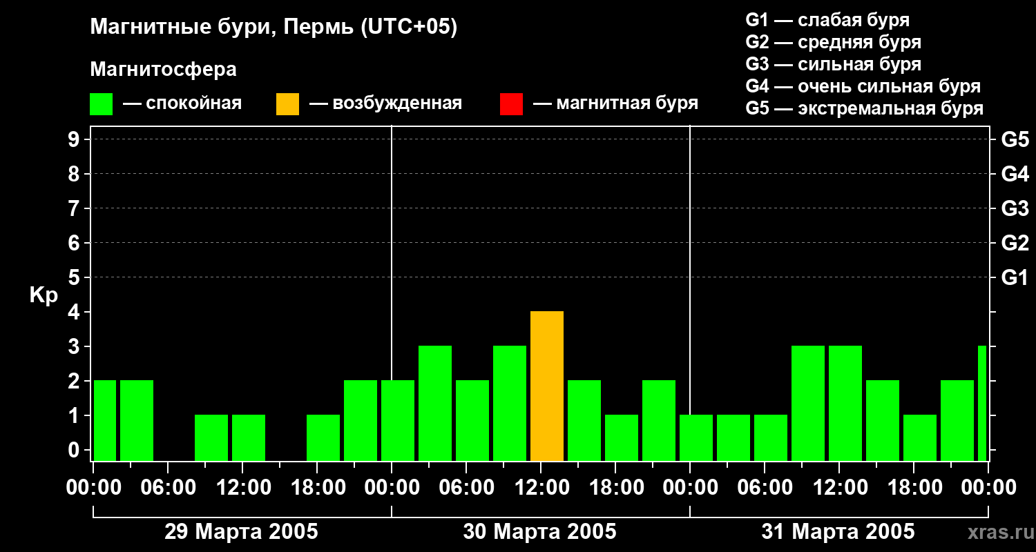 Изменения геомагнитного индекса Kp с 29 по 31 марта 2005 года для средних широт