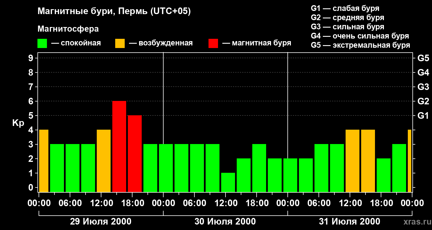 Изменения геомагнитного индекса Kp с 29 по 31 июля 2000 года для средних широт