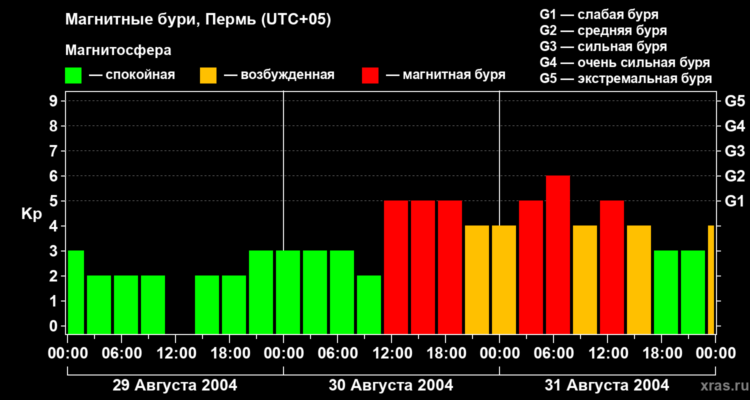Изменения геомагнитного индекса Kp с 29 по 31 августа 2004 года для средних широт