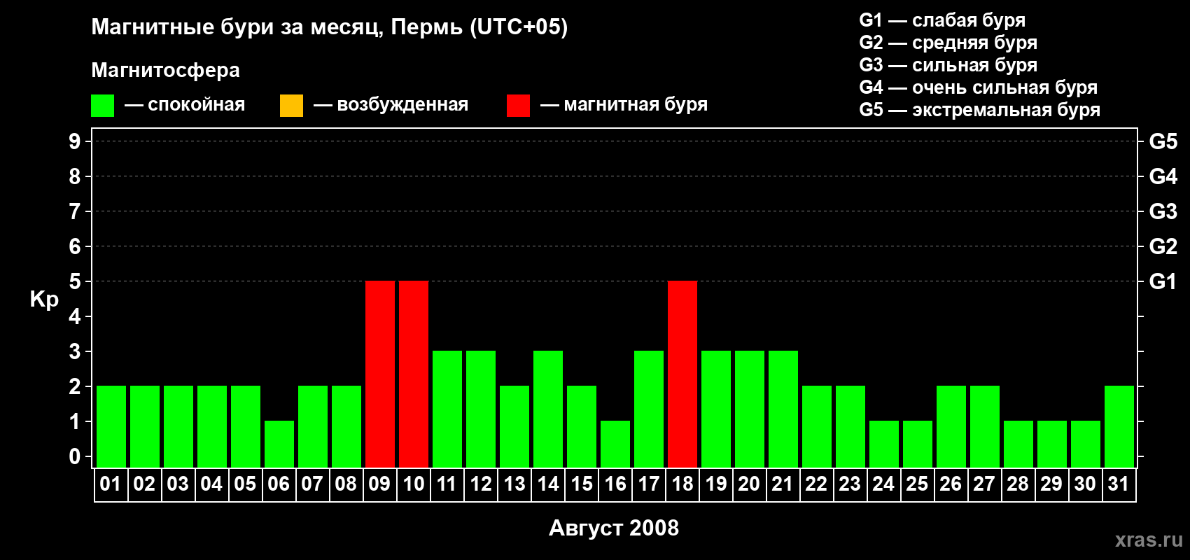 Изменения максимального суточного геомагнитного индекса Kp в августе 2008 года для средних широт