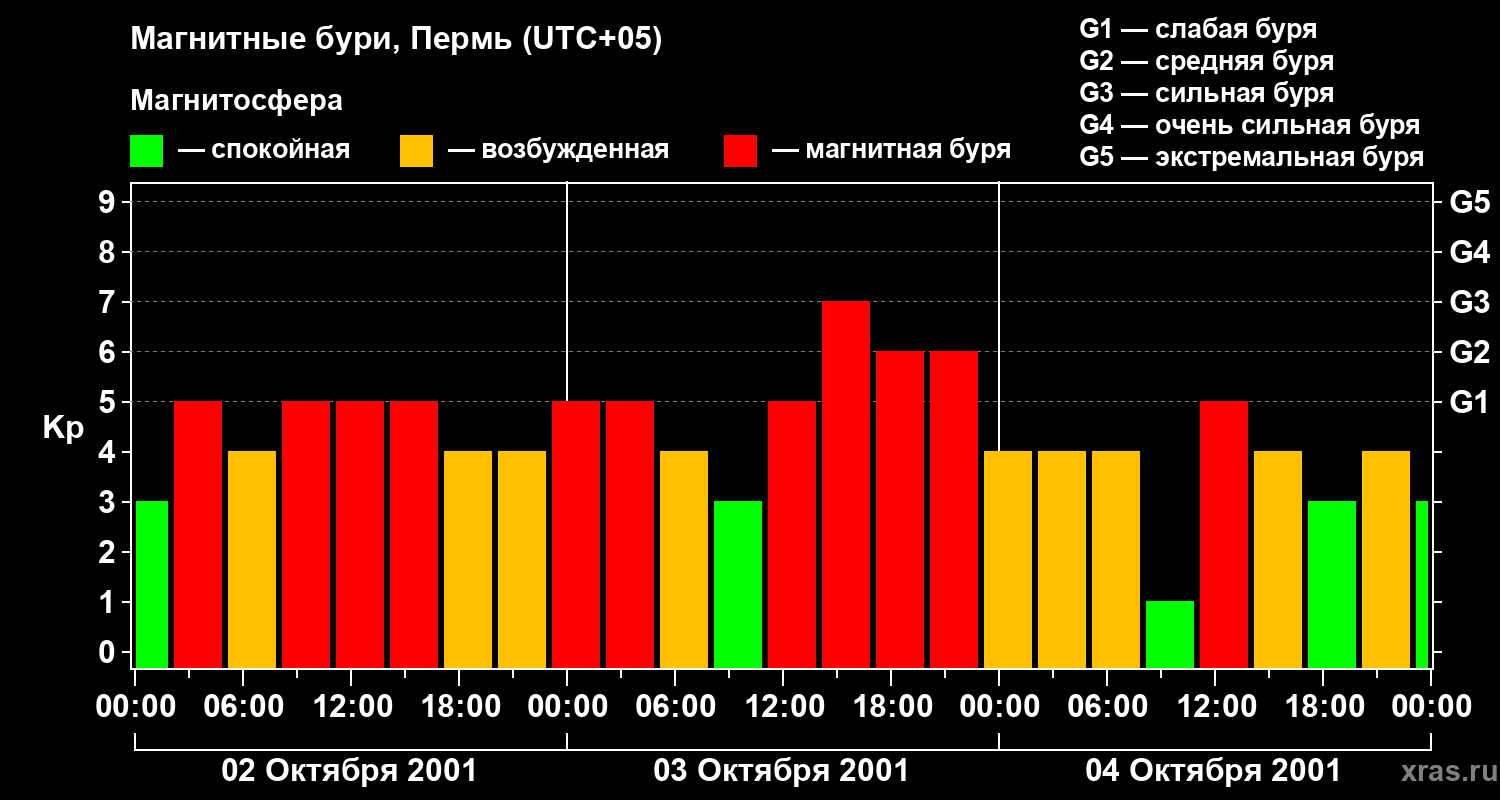Изменения геомагнитного индекса Kp с 2 по 4 октября 2001 года для средних широт