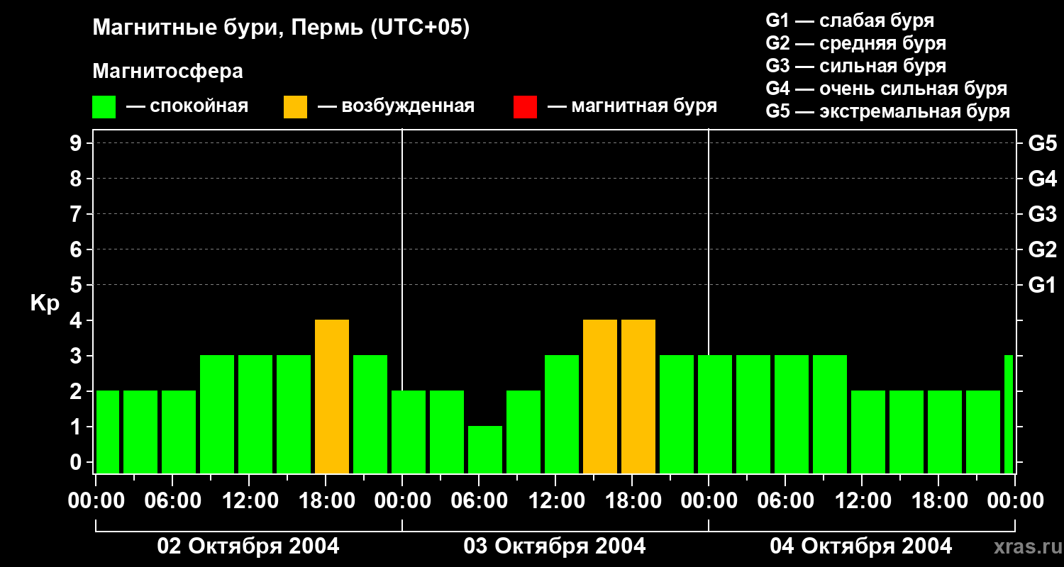 Изменения геомагнитного индекса Kp с 2 по 4 октября 2004 года для средних широт