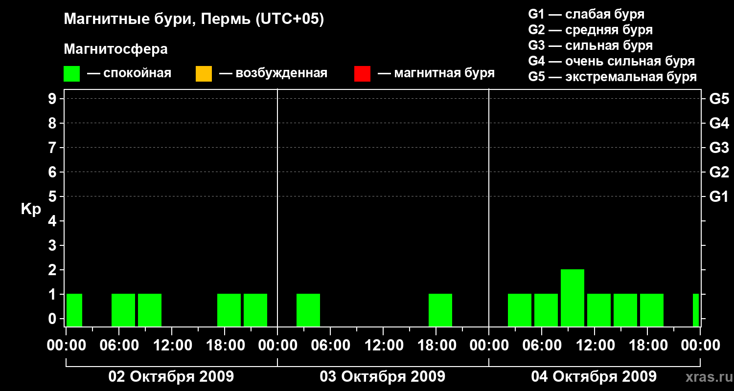 Изменения геомагнитного индекса Kp с 2 по 4 октября 2009 года для средних широт