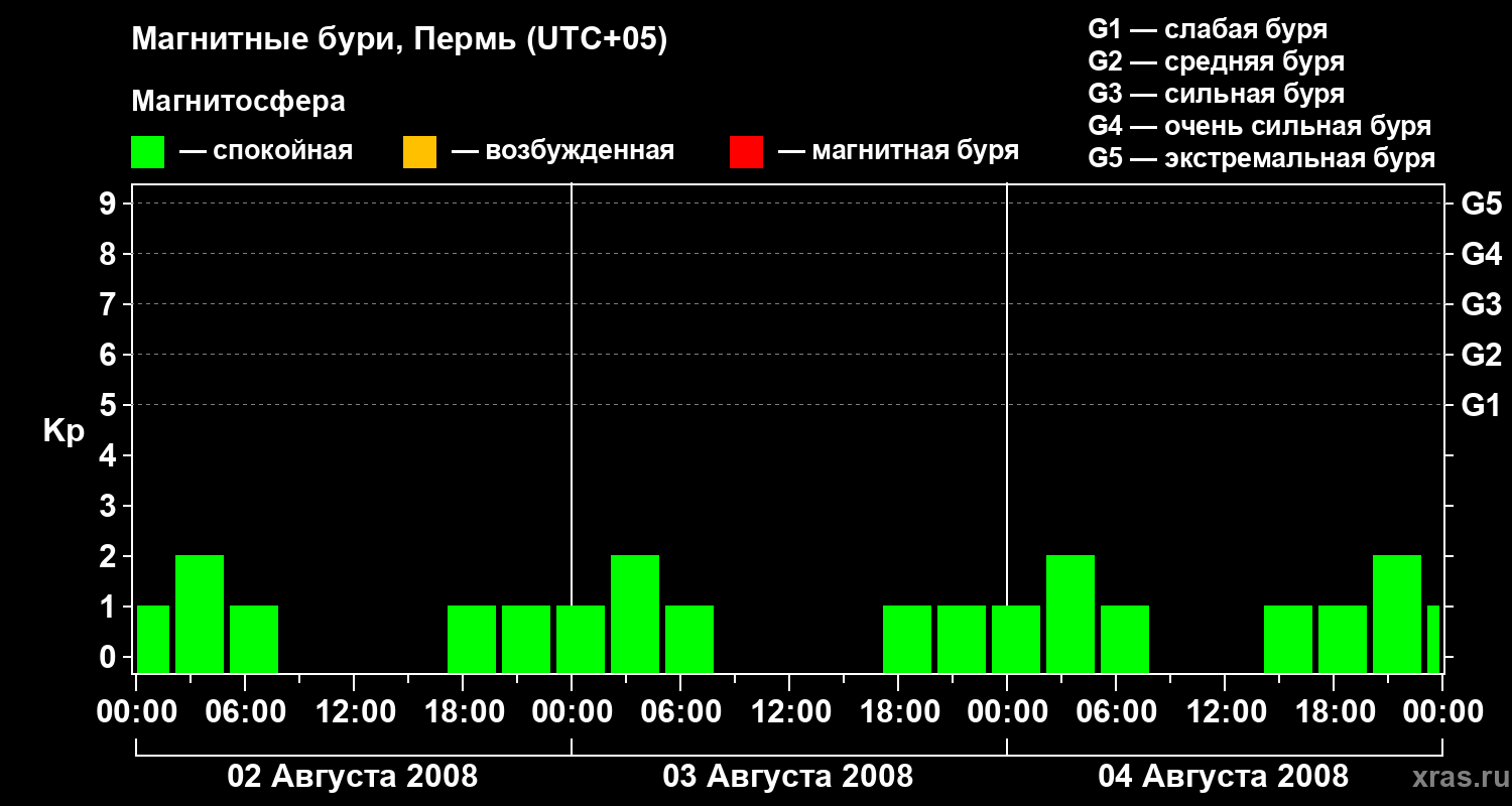Изменения геомагнитного индекса Kp с 2 по 4 августа 2008 года для средних широт