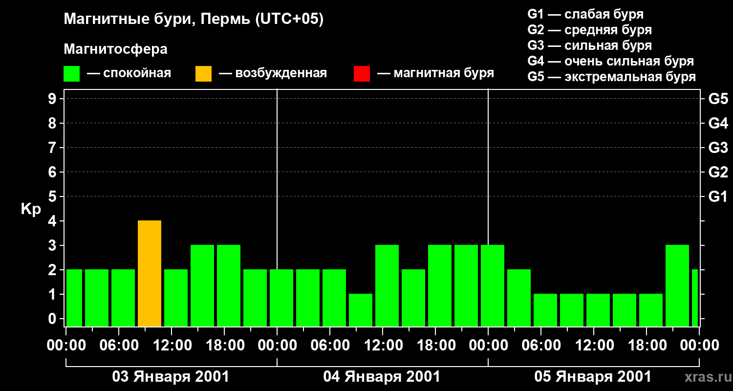 Изменения геомагнитного индекса Kp с 3 по 5 января 2001 года для средних широт