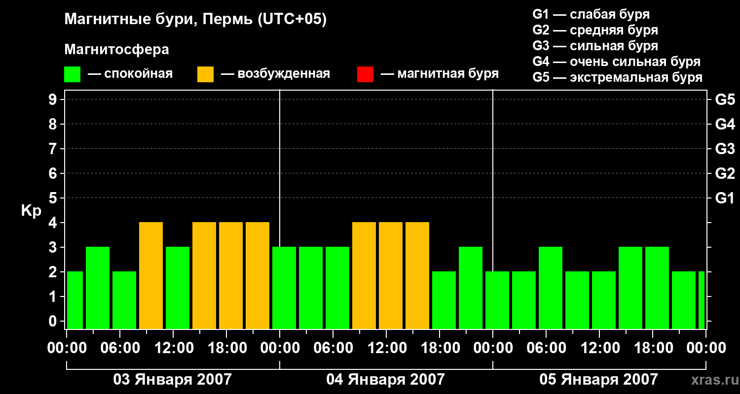 Изменения геомагнитного индекса Kp с 3 по 5 января 2007 года для средних широт