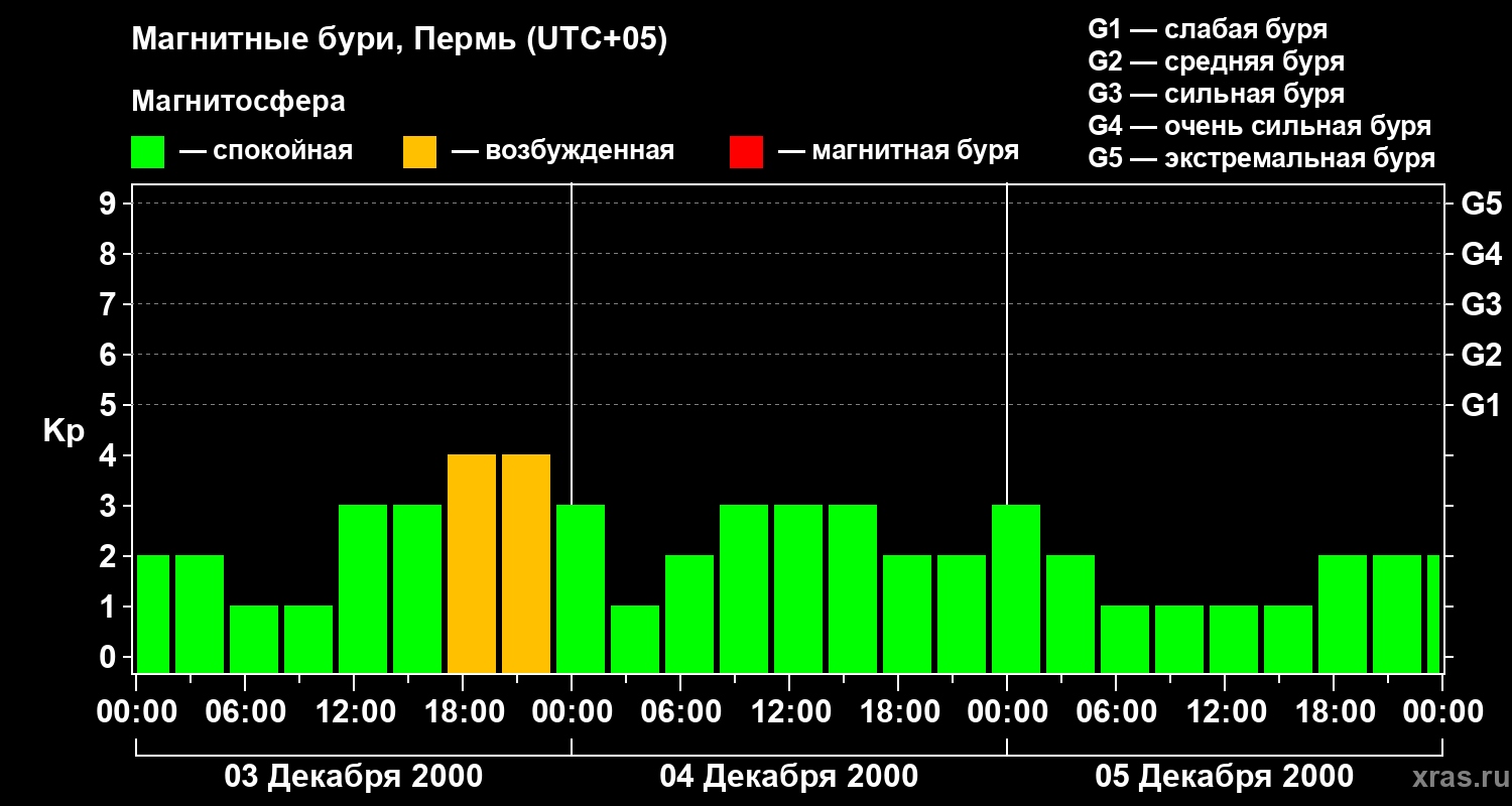 Изменения геомагнитного индекса Kp с 3 по 5 декабря 2000 года для средних широт