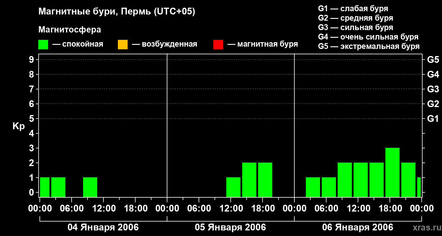 Изменения геомагнитного индекса Kp с 4 по 6 января 2006 года для средних широт