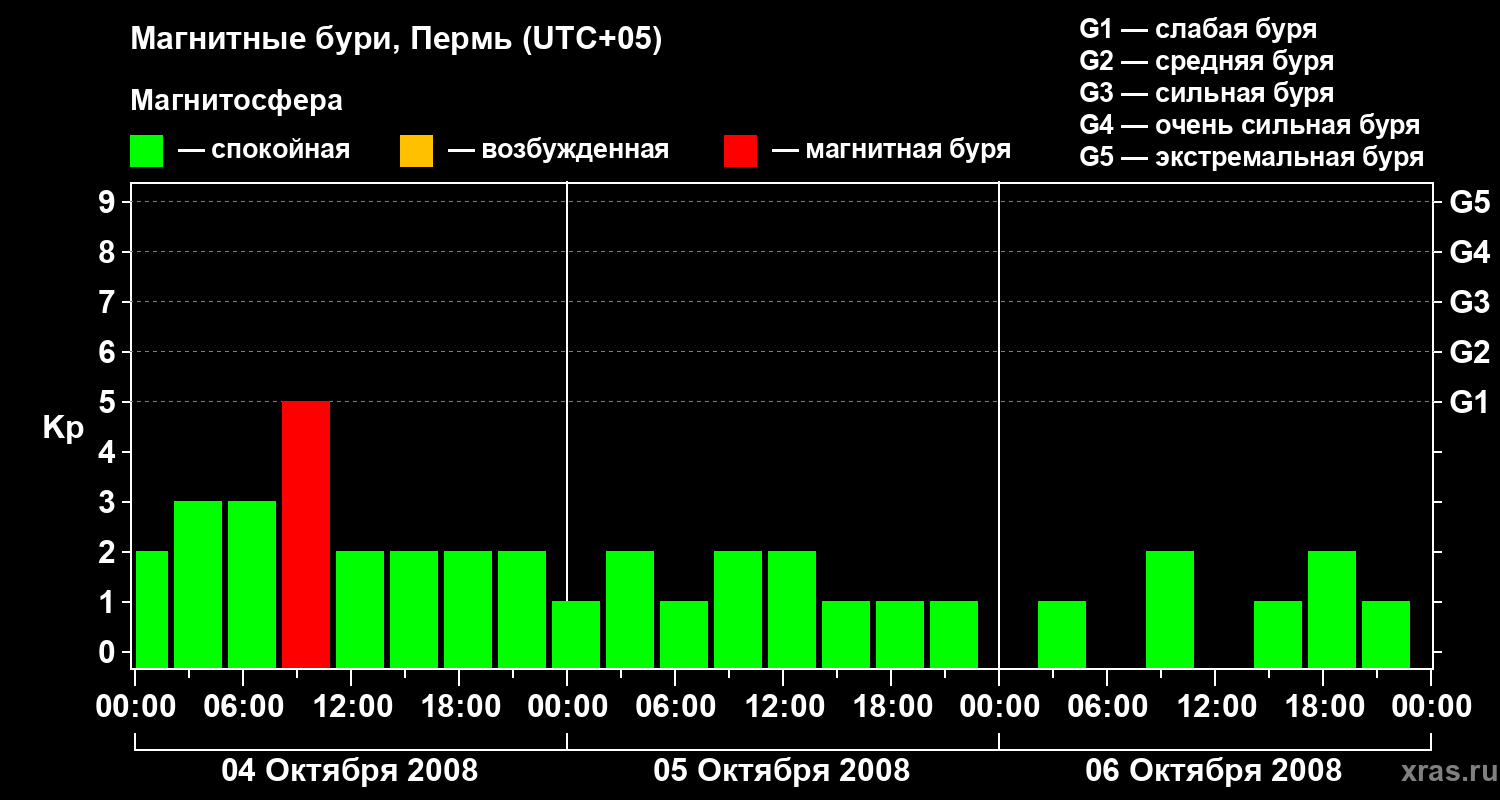 Изменения геомагнитного индекса Kp с 4 по 6 октября 2008 года для средних широт