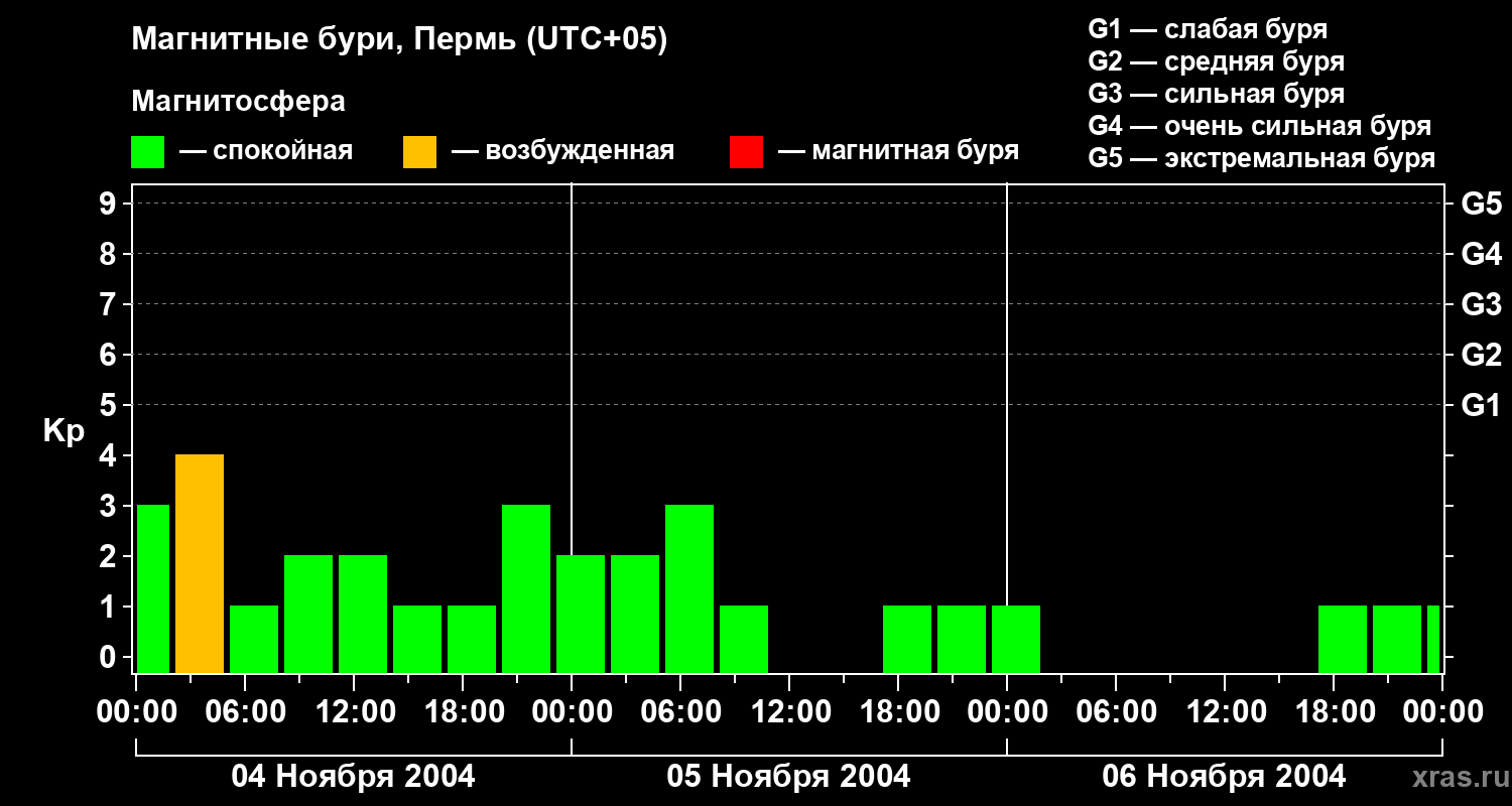 Изменения геомагнитного индекса Kp с 4 по 6 ноября 2004 года для средних широт