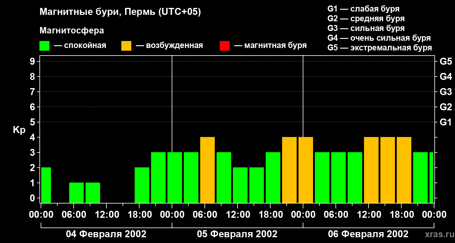 Изменения геомагнитного индекса Kp с 4 по 6 февраля 2002 года для средних широт