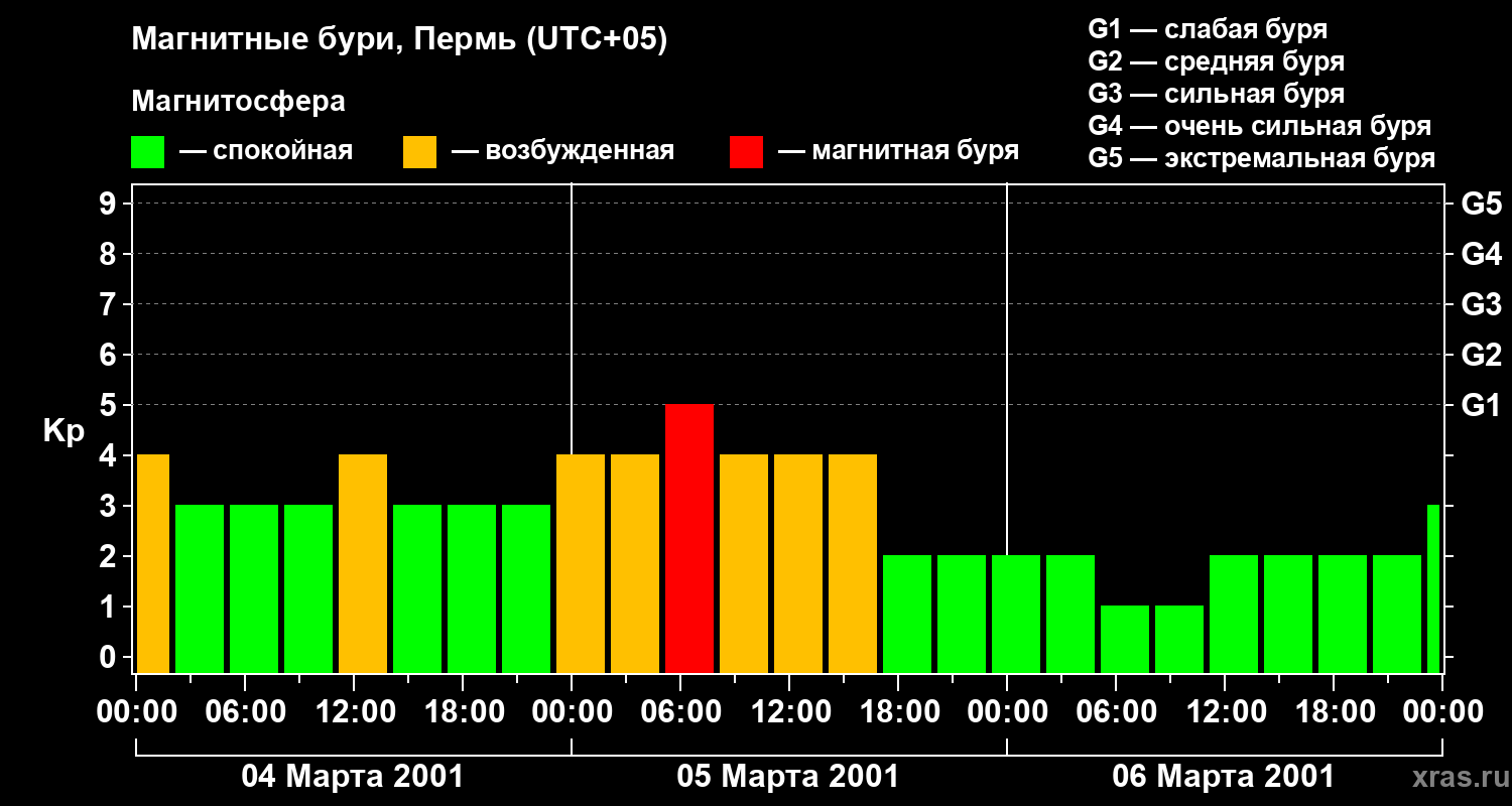 Изменения геомагнитного индекса Kp с 4 по 6 марта 2001 года для средних широт