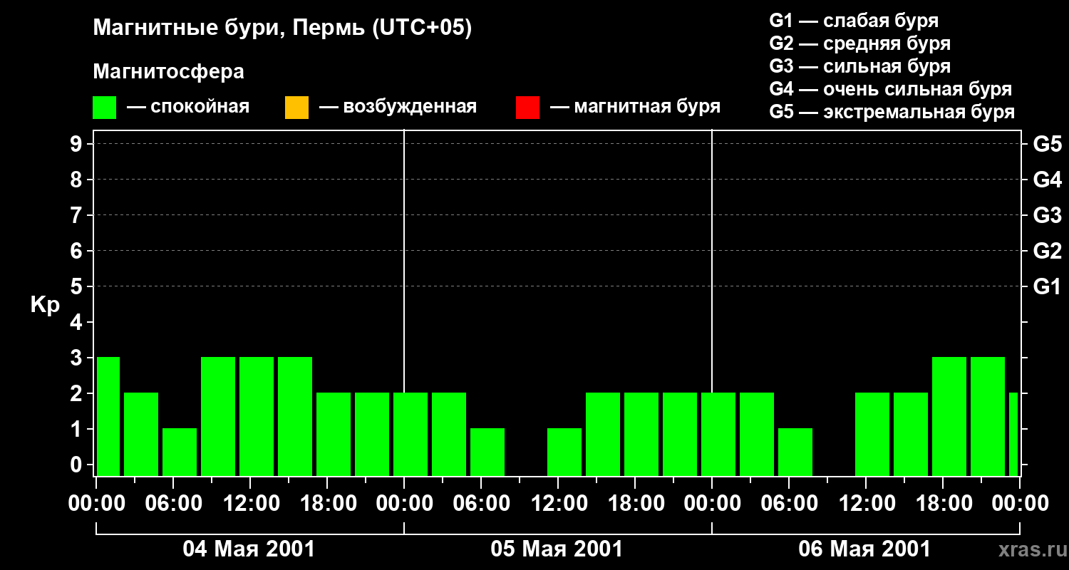 Изменения геомагнитного индекса Kp с 4 по 6 мая 2001 года для средних широт