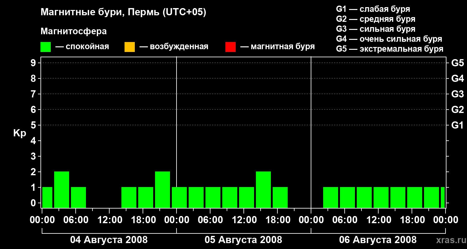 Изменения геомагнитного индекса Kp с 4 по 6 августа 2008 года для средних широт