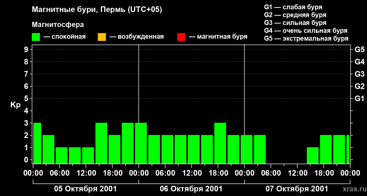 Изменения геомагнитного индекса Kp с 5 по 7 октября 2001 года для средних широт