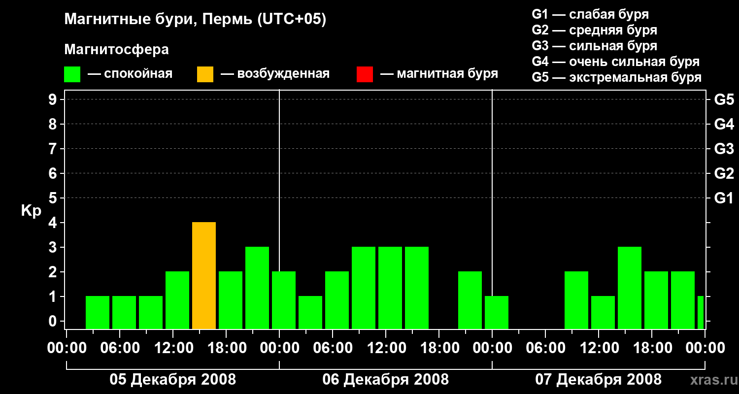 Изменения геомагнитного индекса Kp с 5 по 7 декабря 2008 года для средних широт