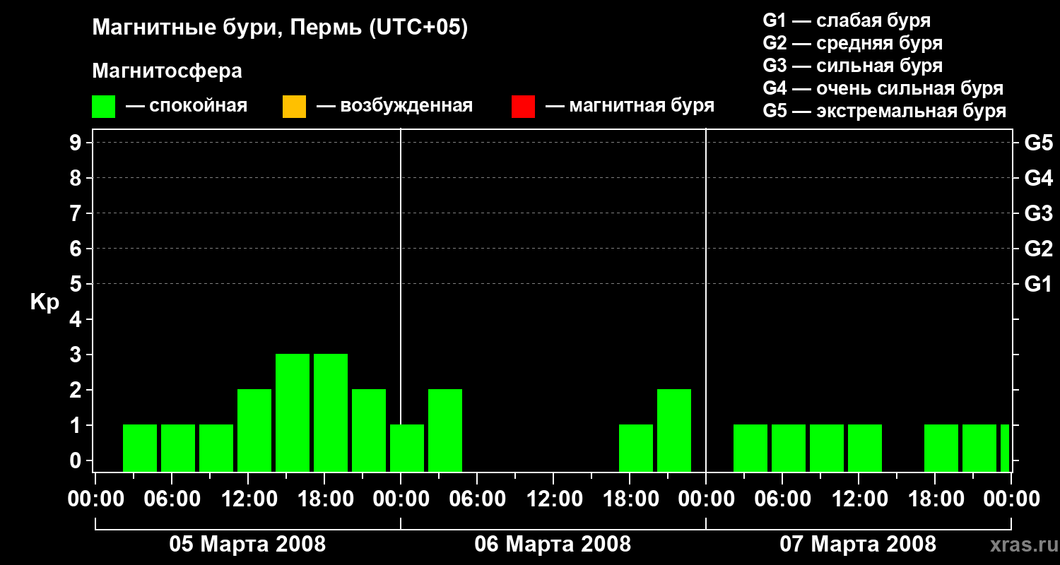 Изменения геомагнитного индекса Kp с 5 по 7 марта 2008 года для средних широт