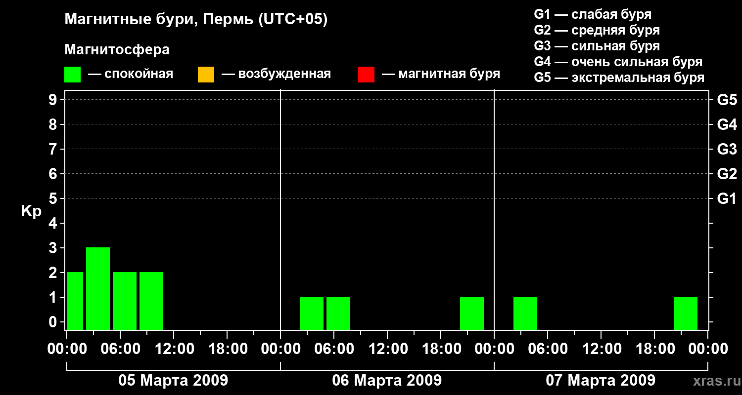 Изменения геомагнитного индекса Kp с 5 по 7 марта 2009 года для средних широт