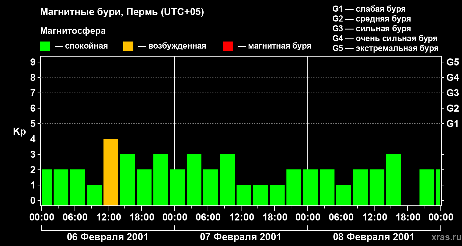 Изменения геомагнитного индекса Kp с 6 по 8 февраля 2001 года для средних широт
