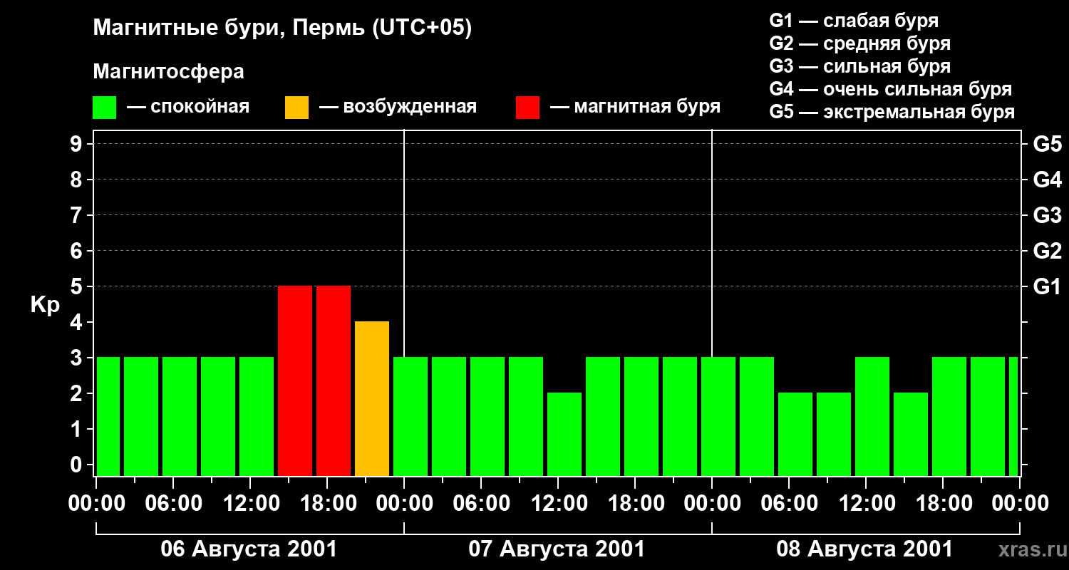 Изменения геомагнитного индекса Kp с 6 по 8 августа 2001 года для средних широт