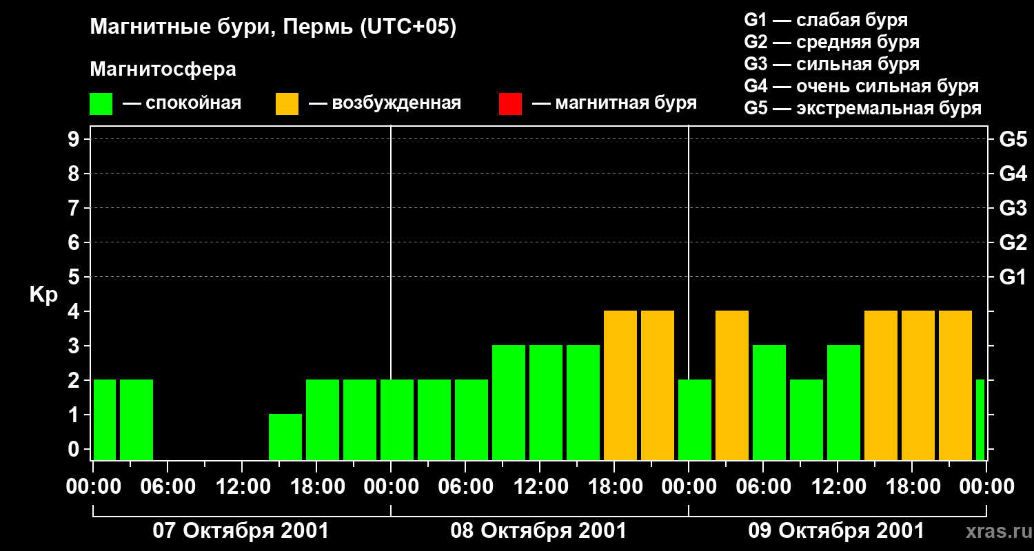 Изменения геомагнитного индекса Kp с 7 по 9 октября 2001 года для средних широт