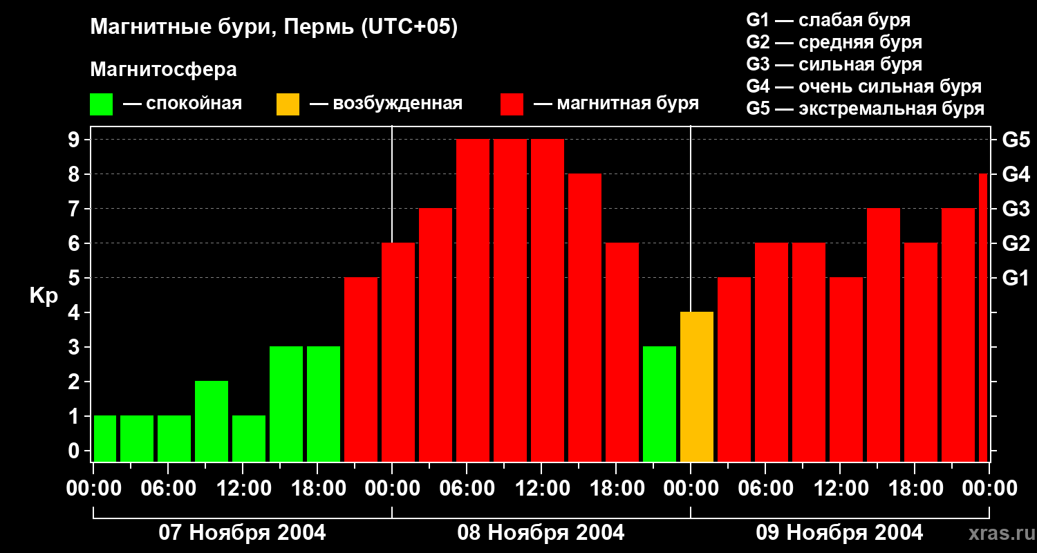 Изменения геомагнитного индекса Kp с 7 по 9 ноября 2004 года для средних широт