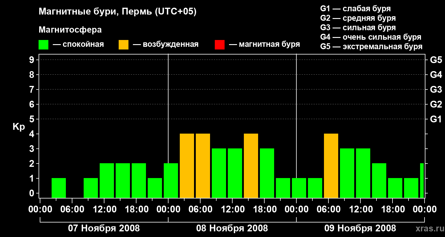 Изменения геомагнитного индекса Kp с 7 по 9 ноября 2008 года для средних широт