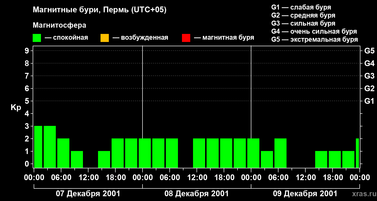 Изменения геомагнитного индекса Kp с 7 по 9 декабря 2001 года для средних широт