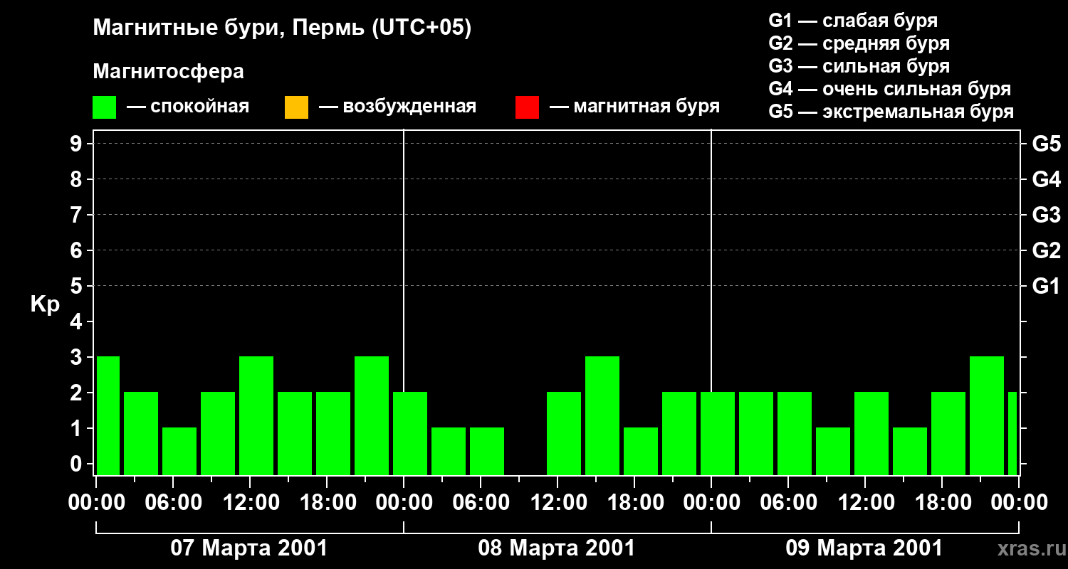 Изменения геомагнитного индекса Kp с 7 по 9 марта 2001 года для средних широт