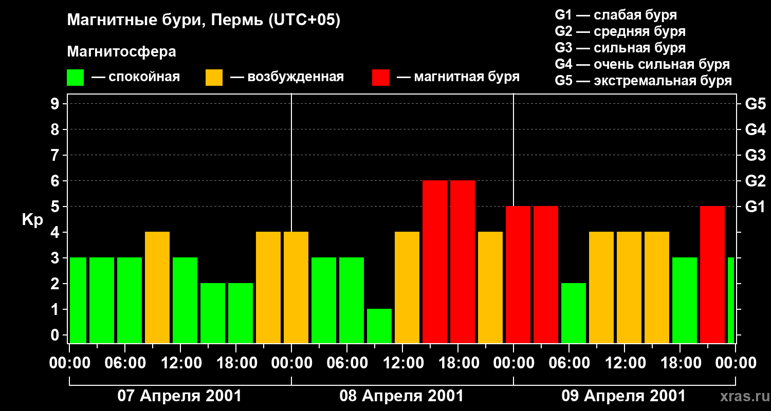 Изменения геомагнитного индекса Kp с 7 по 9 апреля 2001 года для средних широт