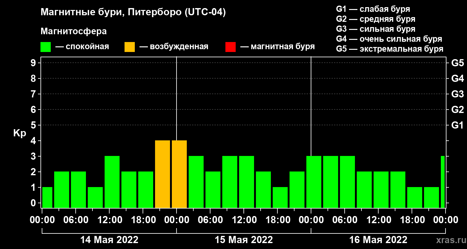 Изменения геомагнитного индекса Kp с 14 по 16 мая 2022 года для средних широт